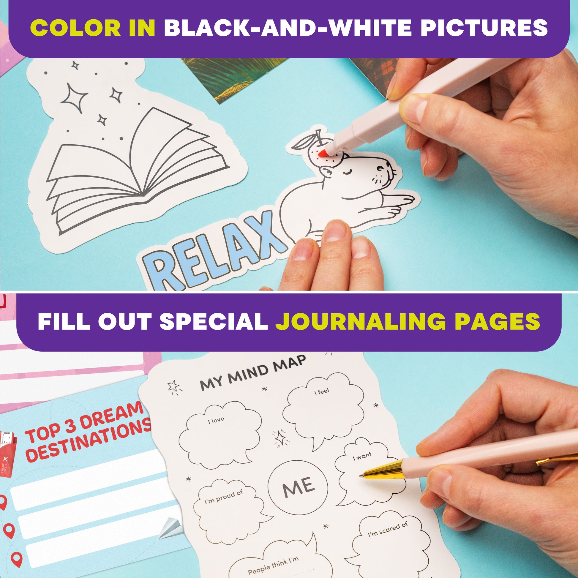 - COLOR, JOURNAL & EXPRESS YOURSELF – This wall collage kit for girls includes black-and-white coloring pages, journaling prompts, and creative activities that support self-expression, creativity, and mindfulness.